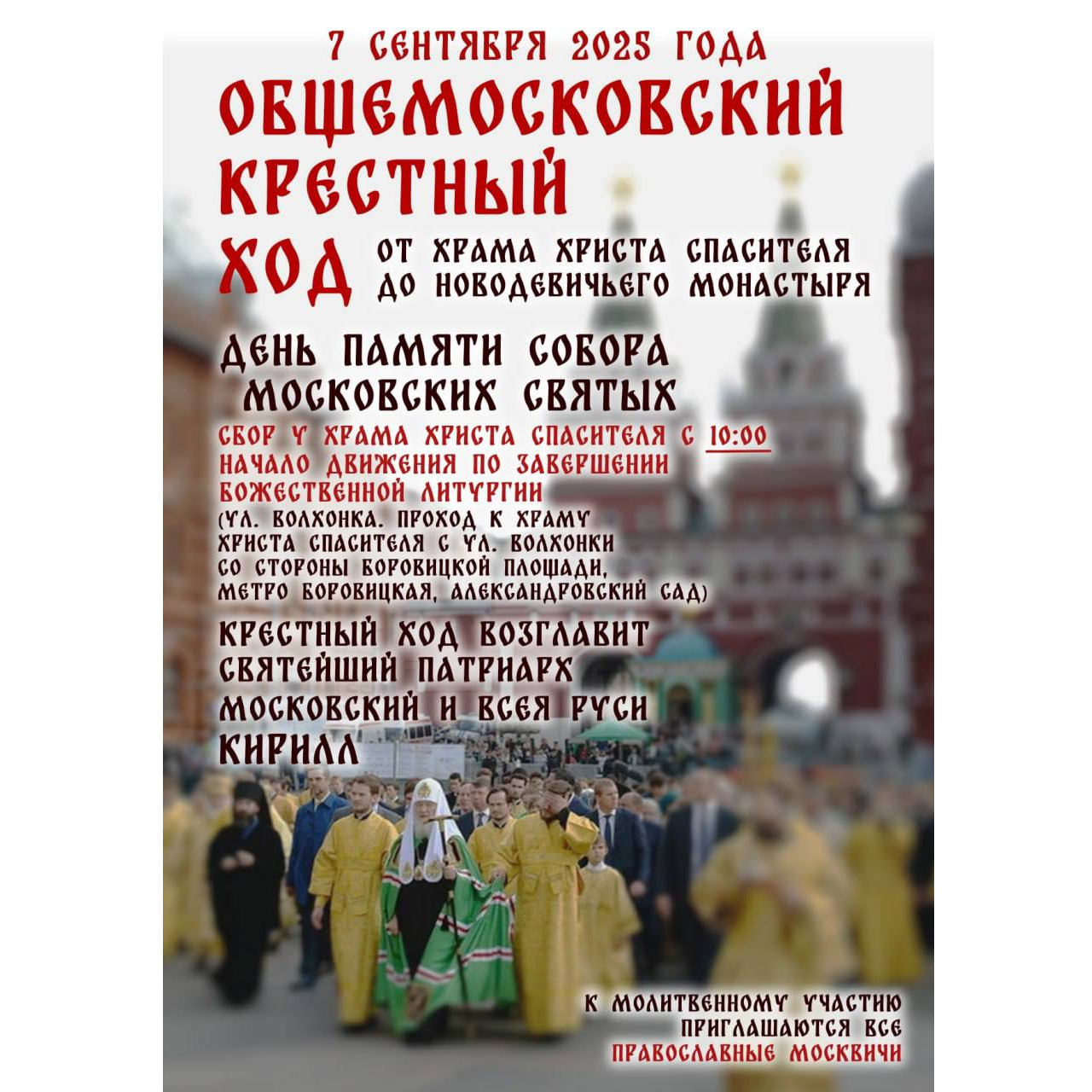 7 сентября, в день празднования Собора Московских святых, по благословению Святейшего Патриарха Московского и всея Руси Кирилла состоится общемосковский крестный ход от кафедрального соборного Храма Христа Спасителя до Новодевичьего ставропигиального женского монастыря.