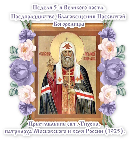 Фото. К 100-летию блаженной кончины святителя Тихона, Патриарха Московского и всея России. В апреле 1925 г. Патриарха положили в частную клинику Бакуниных вблизи Зачатьевского монастыря (само здание по адресу Остоженка, 19 сохранилось до наших дней). Руководство только этой лечебница рискнуло принять у себя опального Патриарха. Игумения святой обители с сестрами, насколько это было возможно, помогали ему. В палате не было ни одной иконы, и он попросил матушку принести какую-нибудь икону из монастыря. В больничную палату была доставлена икона Благовещения. По воспоминаниям келейника, 7 апреля Патриарх ближе к вечеру начал сильно волноваться. И, глубоко вдохнув, сказал: «Теперь я усну… крепко и надолго. Ночь будет длинная, темная-темная». В 23:45 он спросил о времени. Услышав ответ, святой сказал: «Ну, слава Богу» и начал широко креститься. На третьем крестном знамении рука святителя Тихона упала. Его кончина совершилась в день Благовещения Пресвятой Богородицы.