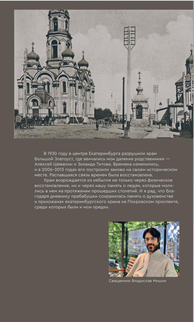 События 1897-1899 годов, описываемые в дневнике, отделяет 15 лет от начала новой эпохи, которая привела к полному слому старого миропорядка. Пройдет 20 лет с момента описываемых событий, и в нескольких кварталах от того места в Екатеринбурге, где жили мои прабабушка и прадедушка, совершится преступление которое патриарх Тихон в своей проповеди назвал «ужасным делом» - убийство царской семьи